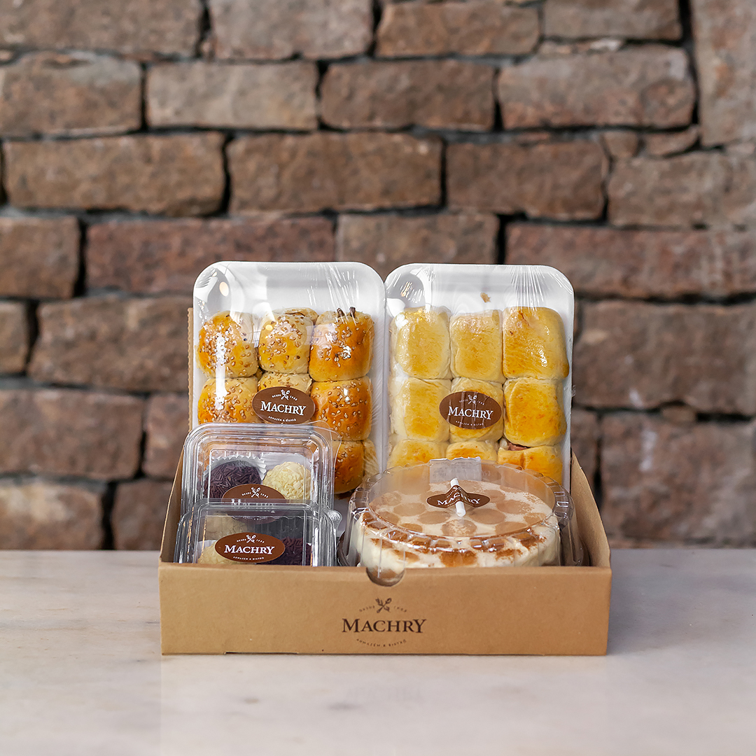 Box com 1 torta de banana (rende 4 a 6 fatias),4 branquinhos, 4 brigadeiros, 9 sanduichinhos de Ragu e 9 cachorrinhos-quentes.