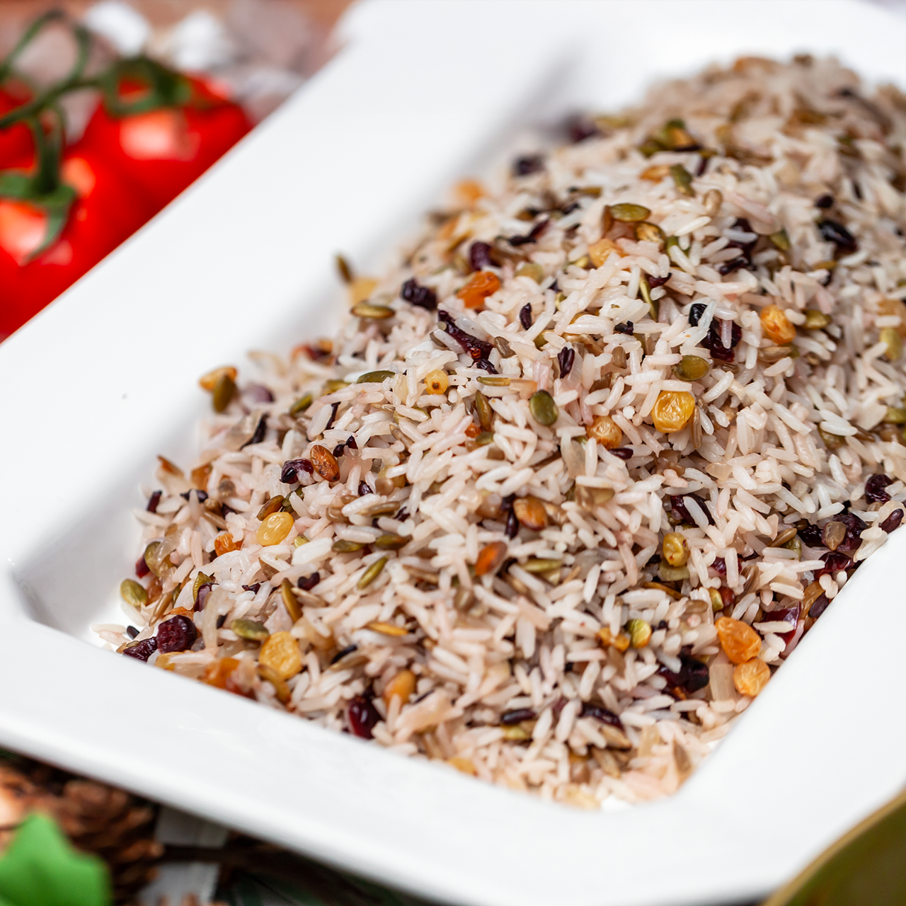 Receita preparada com arroz branco e negro, trio de quinoas cozidas em caldo de legumes e salteado em finíssimas lâminas de cebola, cramberry e passas brancas embebidas em espumante, e finalizadas com pepita de girassol torrada e sementes de abobora.