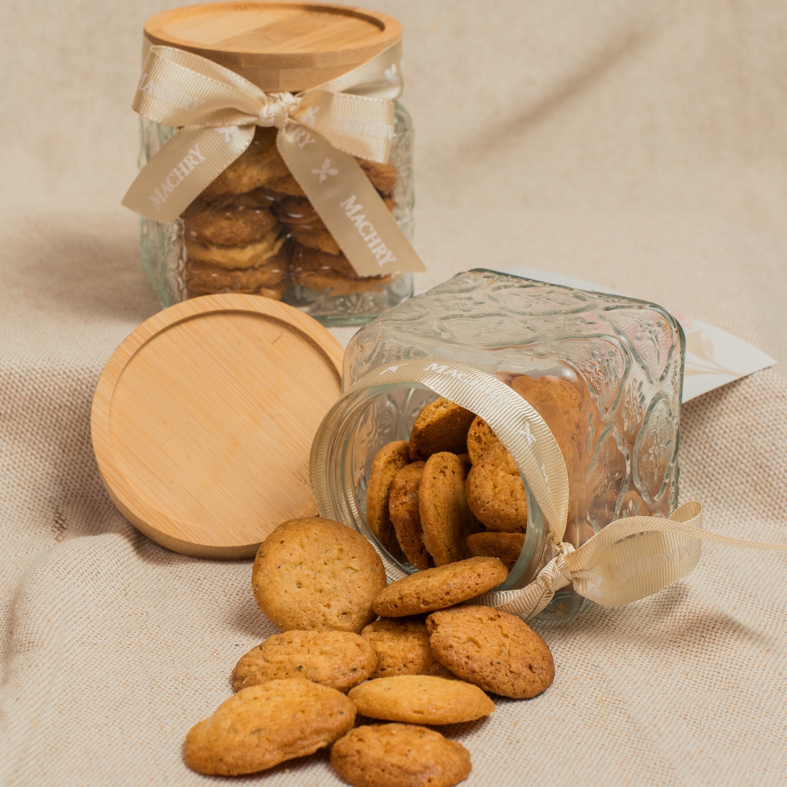 Vidro Decorado com os biscoitos Machry de chocolate branco com Hibisco. Pote Com 150g.