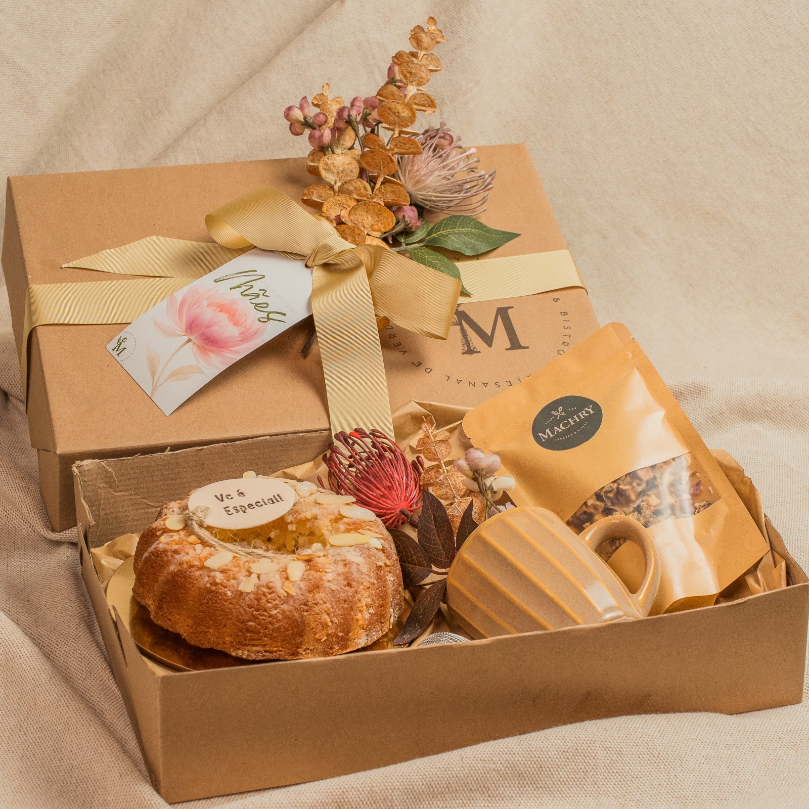 Caixa parda GG, caneca, chá iara de maçã, hibisco e especiarias, placa cerâmica com mensagem: “Vc é especial”,
