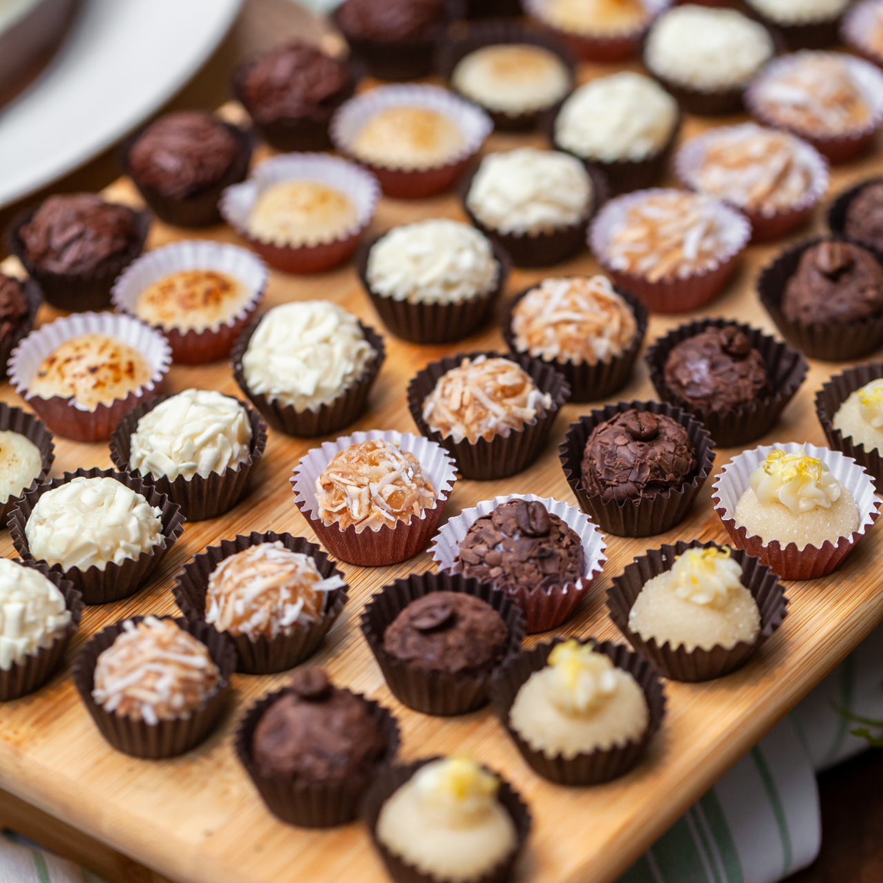 Conheça o nosso novo Box de Docinhos Gourmet, que incluem: Brigadeiros, Branquinhos, Doce de Leite com côco, Brigadeiros com café, Brigadeiro de limão siciliano e Brigadeiro brulée. 8 unidades de cada sabor. (caixa com 48un)
