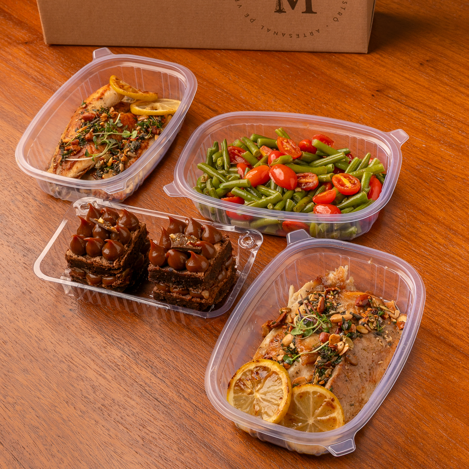 Filé de tilápia grelhada com mix de nuts, acompanhada de vagens holandesas e tomates cereja salteados. De sobremesa dois sanduiches de brownie de chocolate 50% recheado com doce de leite.