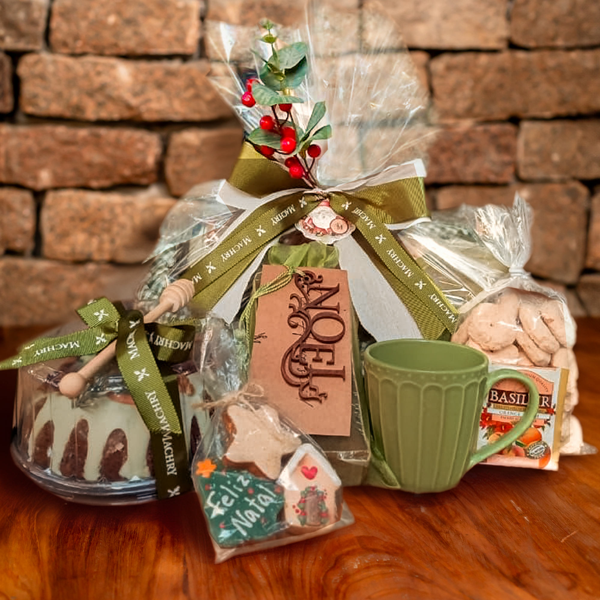 Cesta Oval, Biscoito Coco com Polvilho, Chá Sachê, Bisc Mel Pct 3 pçs, Caneca Cerâmica Verde, Bolo Melestro, Pano de Copa, Bolo Tag Noel.