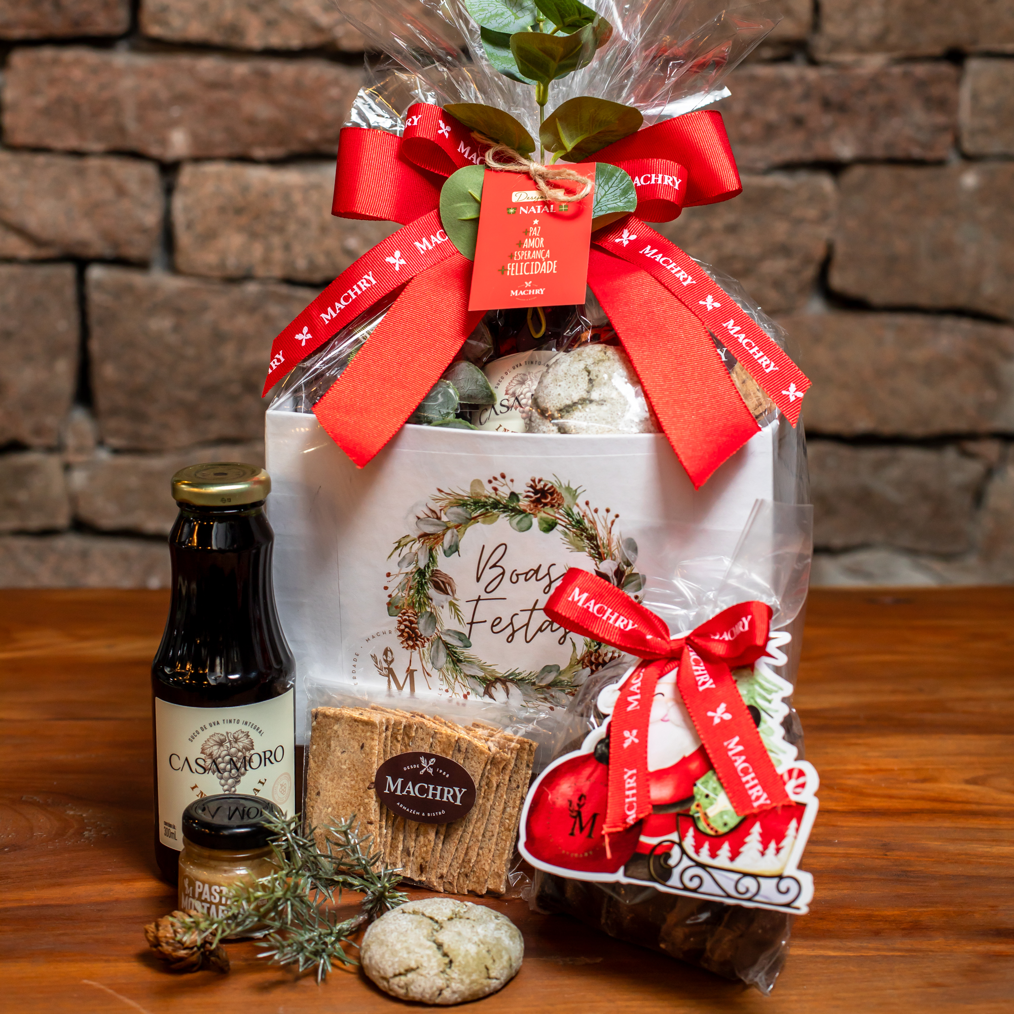 Caixa Retangular Branca com Suco Uva Moro 300 ml, Cookie Natalino, Biscoito Integral Torradinha, Geléia de Amora Dose Única, Biscoito Pão de Mel de Chocolate, Pasta Mortarda Dose única.