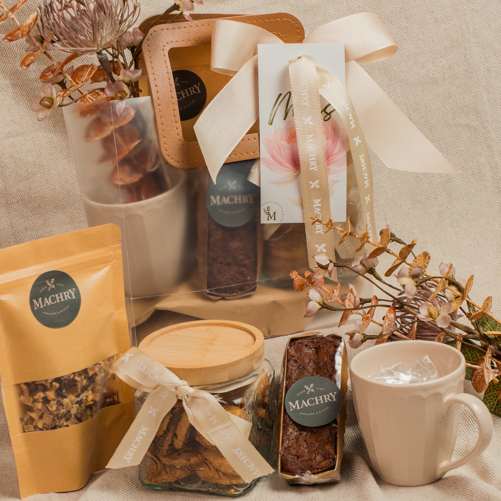 Sacolinha presente, Vidro decorado contendo Biscoitos choco branco e hibisco, Caneca, flores decorativas, chá Hibisco, bolo de Pão de mel.