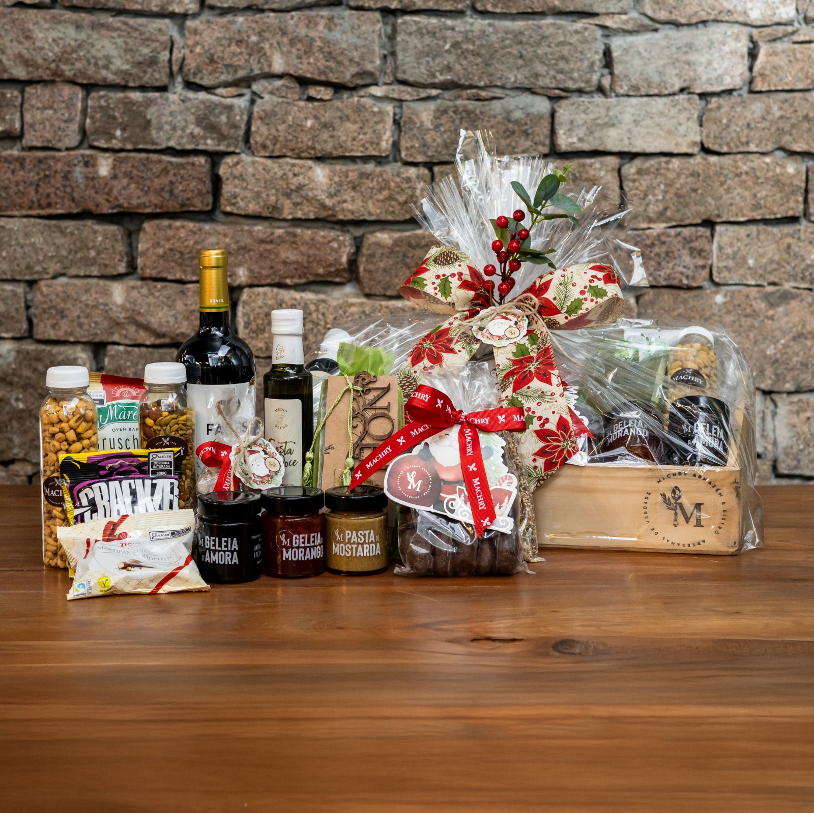 Caixa de madeira G, com Vinho Faces Lídio Carraro Merlot, Pasta Mostarda 145 g, Bruschetta Bull Maretti Tomato, Biscoito Gergelim e Chia, Granola Salgada 250 g, Milho Mel Mostarda 130 g, Bolo Tag Noel, Stollen 300 g, Geleia de Amora 165 g, Biscoito Pão de Mel com Cobertura de Chocolate, Crackzel Pretzel Mel Mostarda, Marzipan Kartoffeln, Cookie Natalino, Geleia de Morango 165 g.