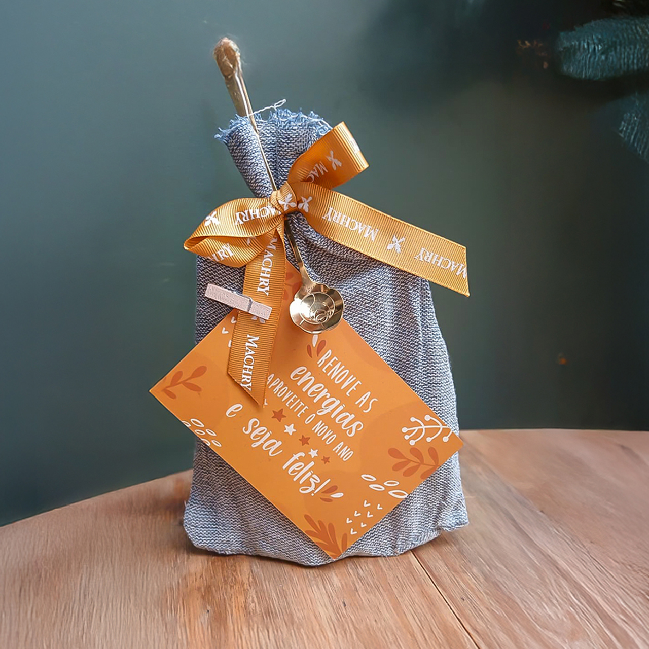 Embalagem Decorativa: Todos os itens vêm acondicionados em um saquinho de Pano Azul Jeans decorativo, agregando valor e sofisticação ao presente.