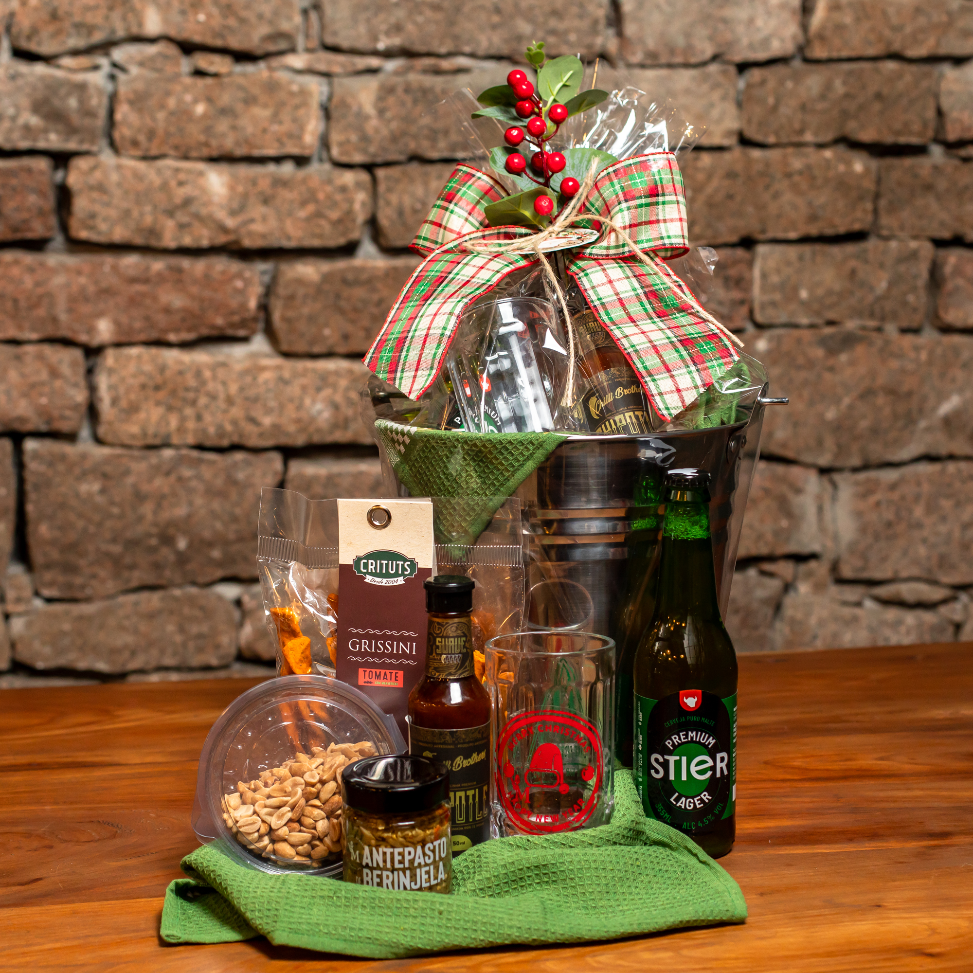 Balde de Gelo Redondo com Cerveja Stier Premium Lager, Cookie Natalino, Antepasto Berinjela 125 g, Caneca de Vidro Choop, Amendoim Salgado 80 g, Molho Pimenta Chipotle, Grissini Tomate e Manjericão.