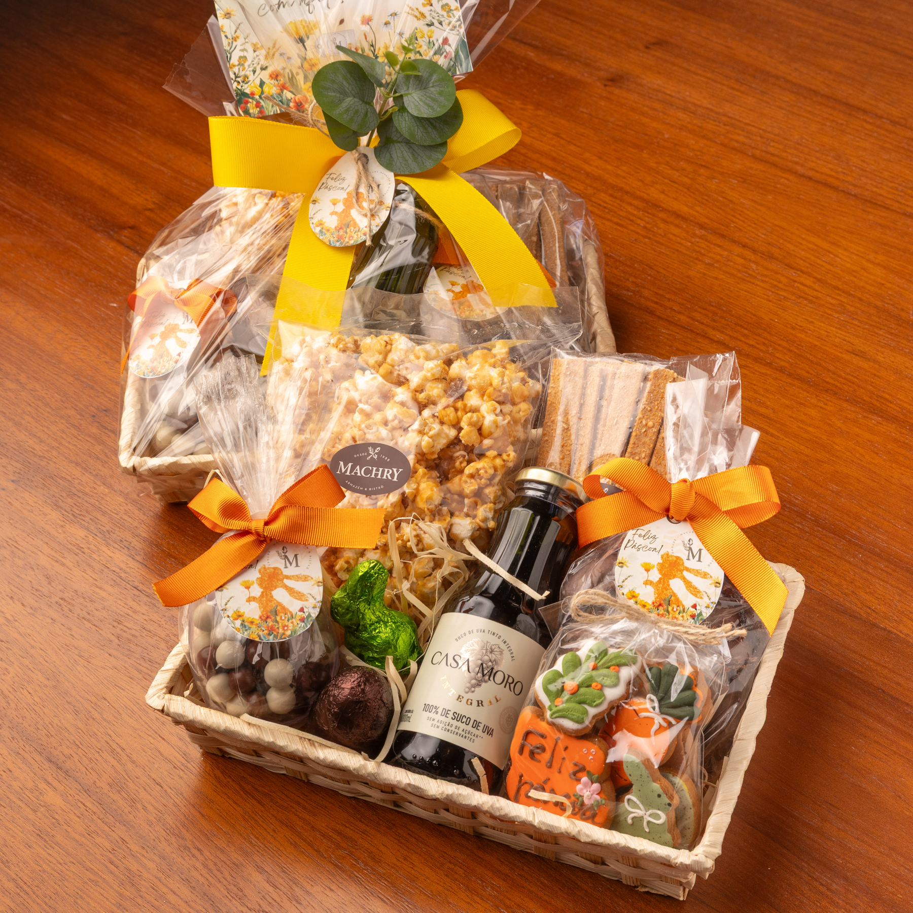 Esta cesta de Páscoa oferece uma experiência festiva completa com suco de uva integral, pipoca gourmet, chocolates temáticos e biscoitos artísticos decorados em uma charmosa base de vime.