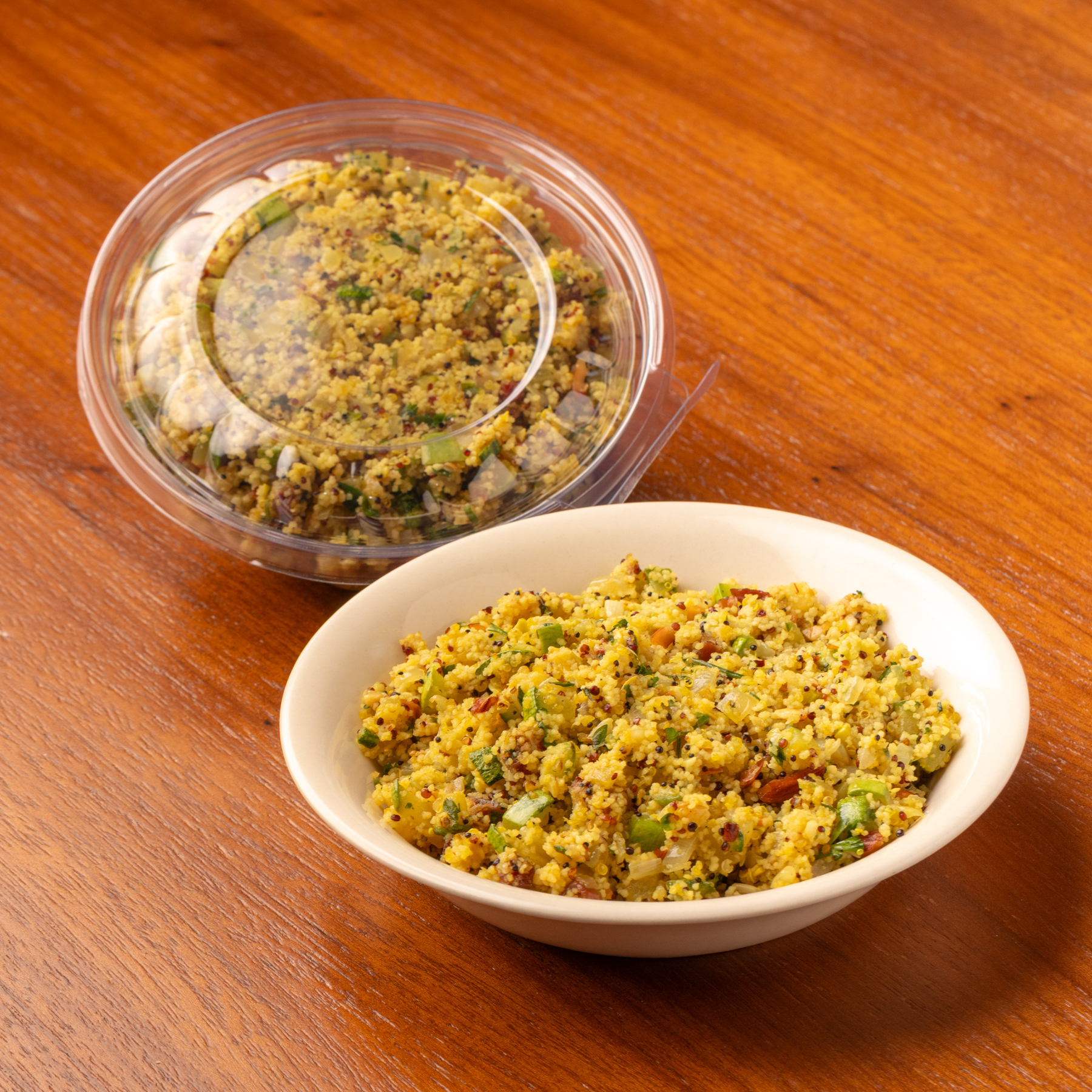 Um prato aromático de Cuscuz Marroquino e Quinoa enriquecido com Abobrinha, temperos e o toque agridoce de Damasco e Tâmara. Recebe o frescor do Limão Siciliano e a crocância do Gergelim Preto. É uma opção completa, saborosa e visualmente vibrante.