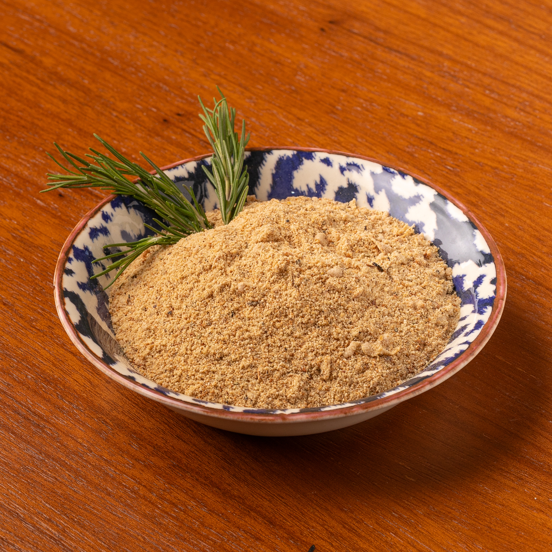 Uma farofa de pão estilo molica, extremamente crocante e saborosa, preparada com uma base rica de margarina e finalizada com um blend aromático de alecrim, manjerona, sálvia, tomilho e tempero verde.