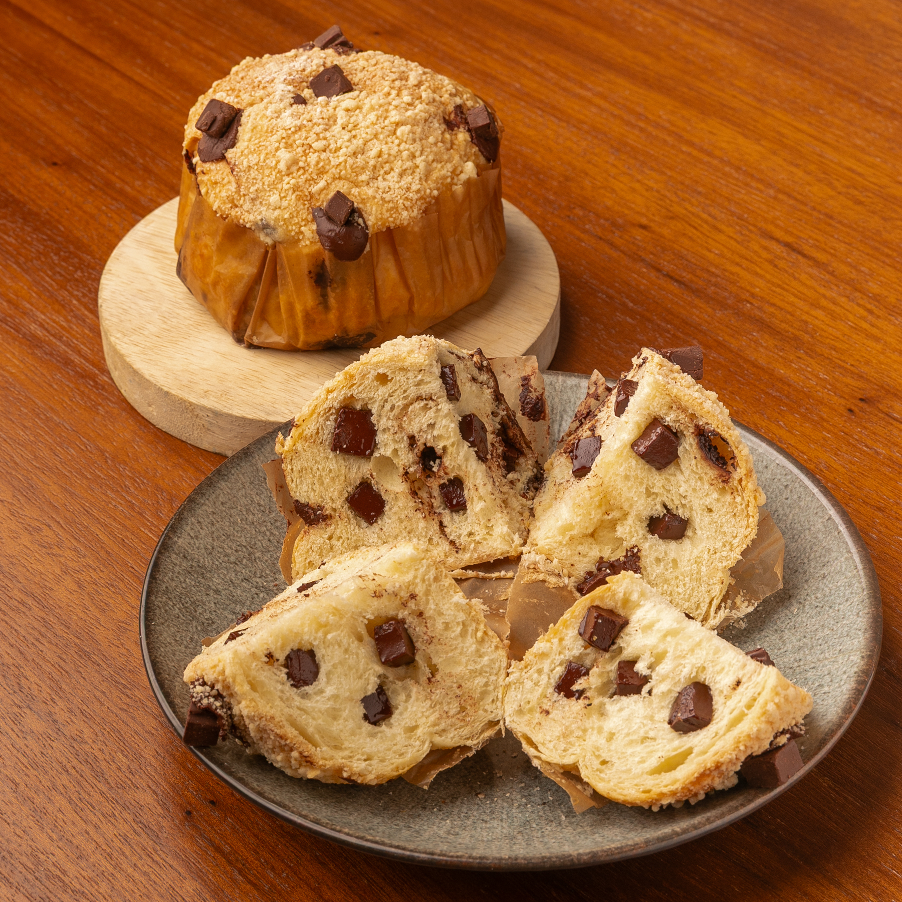 Massa artesanal de fermentação natural extremamente macia, recheada com pedaços generosos de chocolate meio amargo e finalizada com a crocância de uma tradicional farofa de cuca.