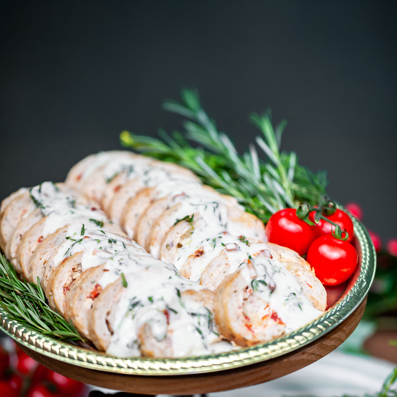 Sofisticado e saboroso! Rocambole de Frango macio coberto por um Molho de Nata cremoso e aveludado. Finalizado com o toque doce e aromático do Tomate Seco e Azeite de ervas.