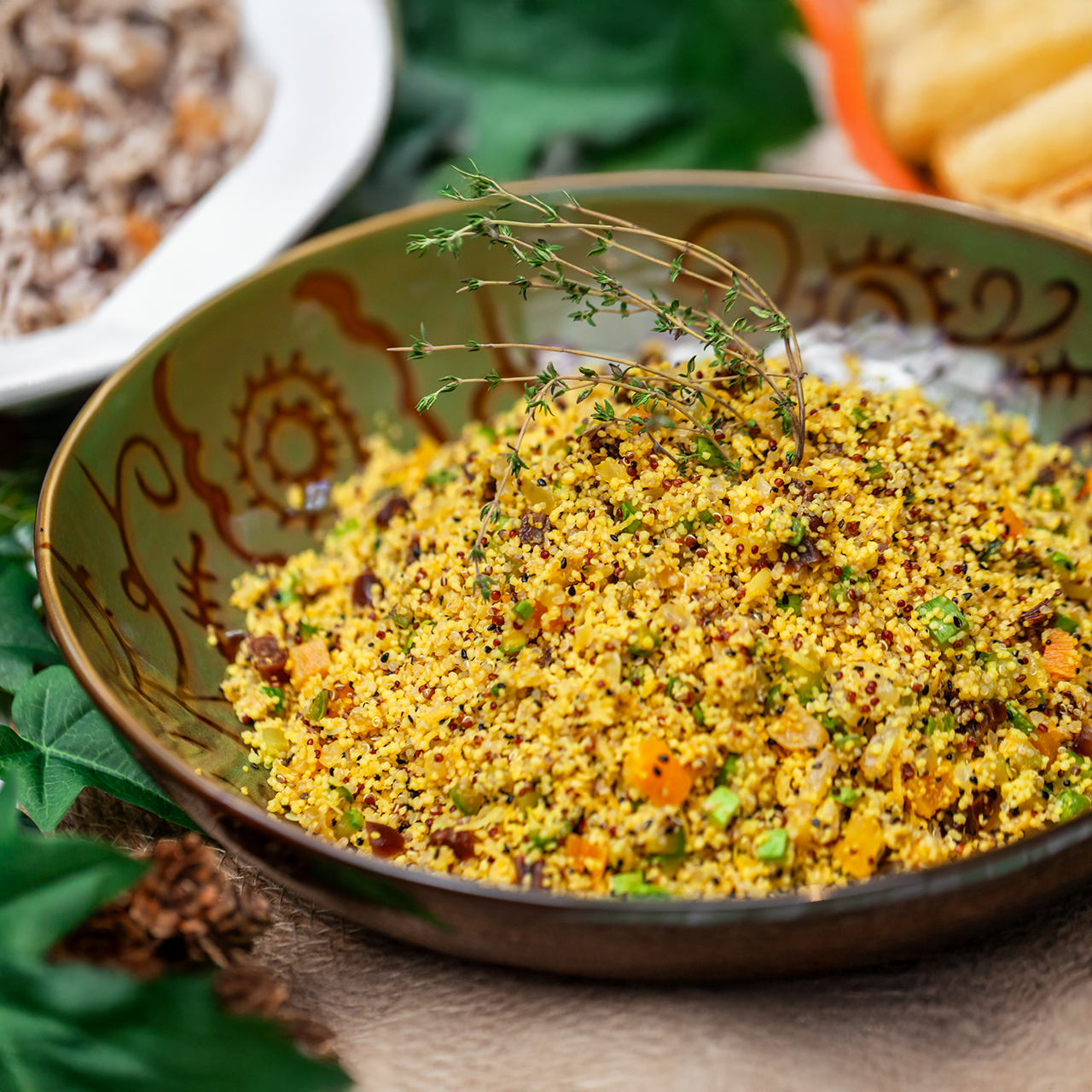 Sabor Festivo e Versátil: Utilizamos Cuscuz Marroquino misturado a uma seleção especial de frutas secas (como damasco, uva-passa e tâmaras), temperos leves e um toque de azeite e limão. O resultado é um prato vibrante e elegante, que pode ser servido frio ou em temperatura ambiente.