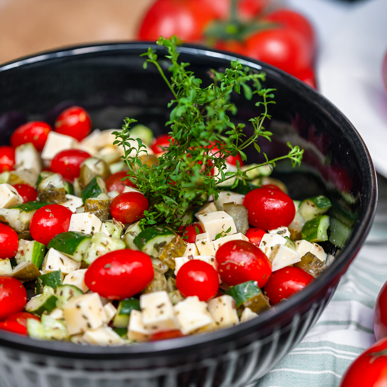Uma salada de sabores contrastantes, combinando o frescor de Tomate Cereja e do Pepino Japonês com Queijo Prato Colonial e a acidez do Pepino em Conserva.