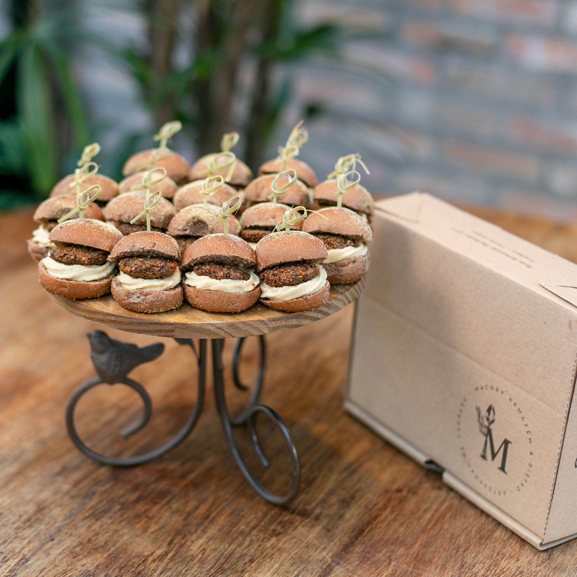 Este mini-sanduíche é ideal para quem busca salgados vegetarianos para festa ou opções de finger food inovadoras e sofisticadas. A riqueza de temperos do falafel e do babaganush garante que este aperitivo se destaque em qualquer coffee break ou coquetel.