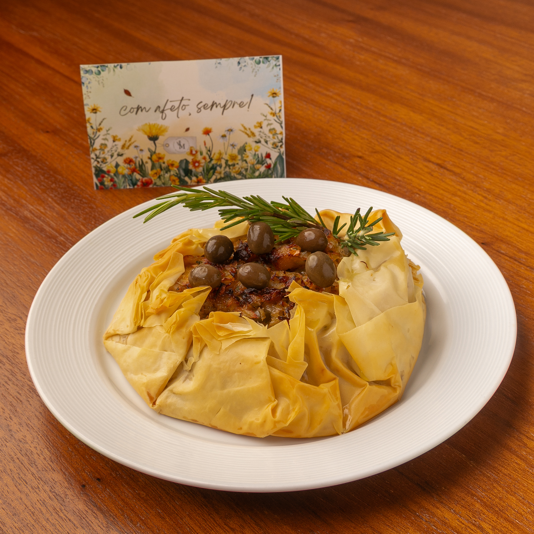Torta de textura leve em massa filo crocante, recheada com cebola e bacalhau em lascas refogado, azeitonas verdes e pretas, e um toque cremoso de leite de coco e tomilho.