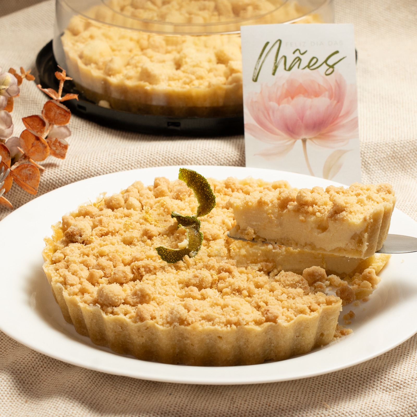 Base crocante, creme de ricota, com requeijão e leite condensado e raspas de limão siciliano. com cobertura de farofa de cuca. Serve de 8 a 10 fatias.